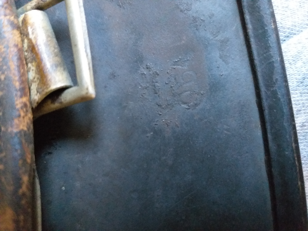 Leer mogelijk bloedvlekken vroegere drager. Indien hij gewond of gedood is op het slagveld is mogelijk de kinriem verwijderd/doorgesneden en kan daarom mogelijk ontbreken