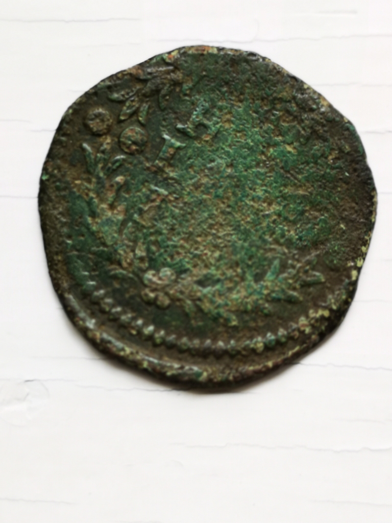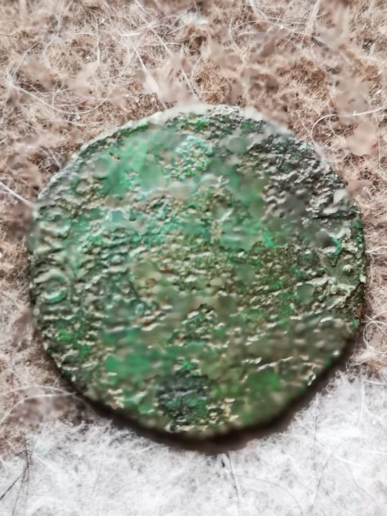De munt heb ik zelf kunnen achterhalen, het is een hollandia duit uit de tijd tussen 1590-1598