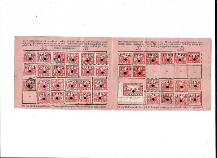 Mocht u het Duits niet machtig zijn zal ik het voor u vertalen.Ein im Vergleich mit der Mitgliedskarte wesentlich repräsentativeres Mitgliedsbuch wurde erst nach längerer Mitgliedschaft, in der Regel nach zwei Jahren, ausgestellt. Die Ausstellung war auf dem parteiinternen Dienstweg beim Reichsschatzmeister der NSDAP zu beantragen, welcher auch dieses Ereignis so wie andere Veränderungen im Parteileben jedes einzelnen Mitgliedes in seiner Zentralkartei dokumentierte. Ausgehändigt wurde das rote Mitgliedsbuch, dessen graphische Gestaltung sich über die Jahre leicht wandelte jedoch nur im Austausch mit der alten Mitgliedskarte, die wie das Buch grundsätzlich Eigentum der NSDAP blieb. Bron: https://www.bundesarchiv.de/DE/Content/ ... nsdap.html