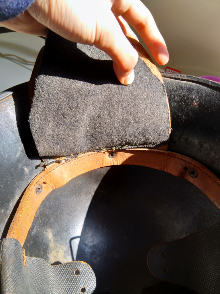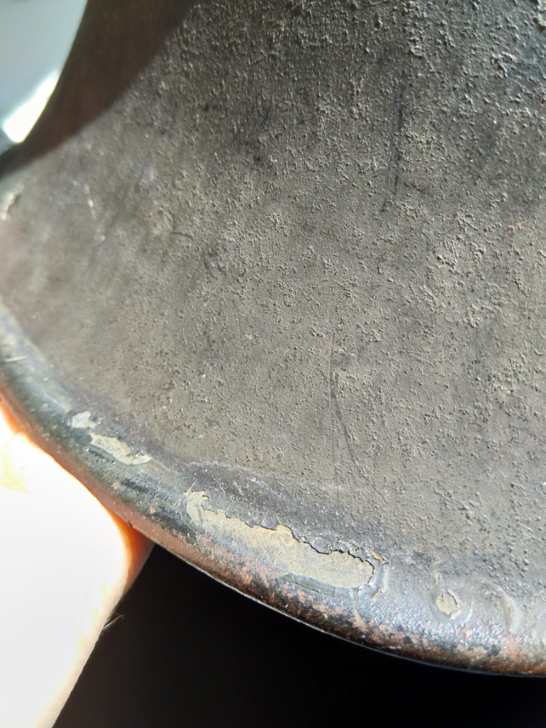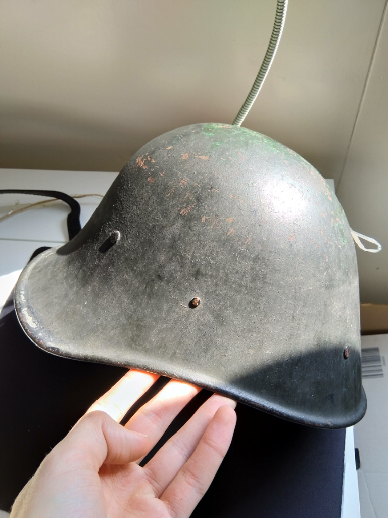 De helm lijkt een bijna nieuwe kinriem te hebben, alhoewel deze mij niet van het Nederlands leger pre1940 afkomstig lijkt. Daarnaast vraag ik me ook af wat voor binnenwerk dit precies is, aangezien er geen stempels of wat dan ook in staan. Een laatste ding is ook dat er een hele aparte donker grijs/groene kleur over het zwart is geschilderd. Maar, onder dat zwart lijkt weer iets groens te zitten?