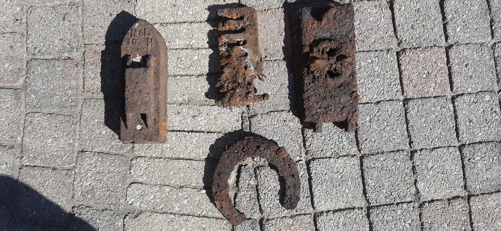 Maar nu kwam ik deze ijzeren objecten tegen. Eentje is makkelijk een hoefijzer. Deze heb ik samen met de gril en de deksel heb ik gevonden rondom een Duitste stelling. Het andere object wat ik zelf dacht dat een oud strijkijzer was heb ik gevonden in de duinen. Het "Strijkijzer" heeft een opdruk die zegt N&L 36 H (1936?). De deksel dacht ik zelf dat het misschien een deksel is van een munitie kist. De "gril" lag in een dumppit met verbrande spullen. Er zitten dan ook veel andere spullen aan versmolten (glas, spijkers, etc) Zouden jullie mij kunnen helpen met het identificeren van deze objecten of het bevestigen van mijn ideeën