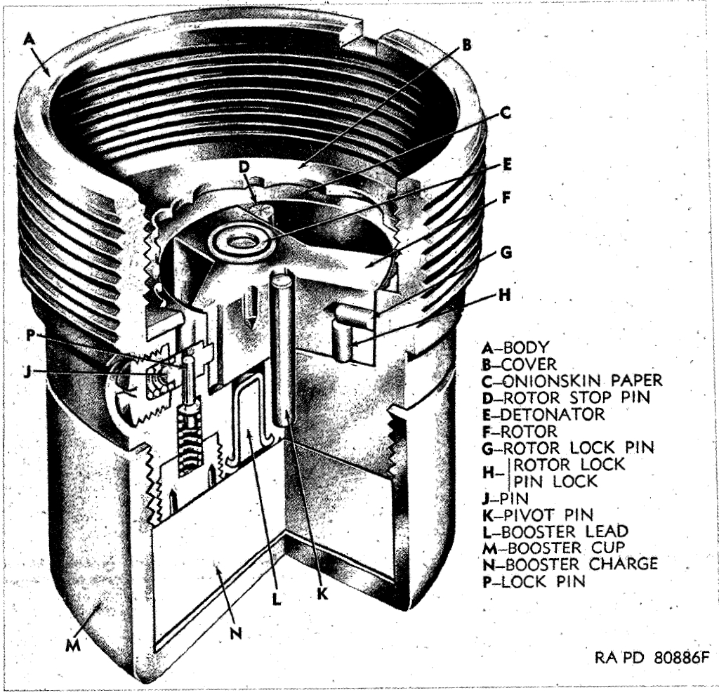 Dit is een complete M21A1 booster. En deze zat onderop de ontsteker van een artilleriegranaat, zoals hier te zien is. De booster op deze foto is een M21A4 en niet een M21A1. Maar die krijg ik zo snel niet gevonden, maar ze verschillen niet zo heel veel van elkaar. De foto dient dan ook alleen ter illustratie.