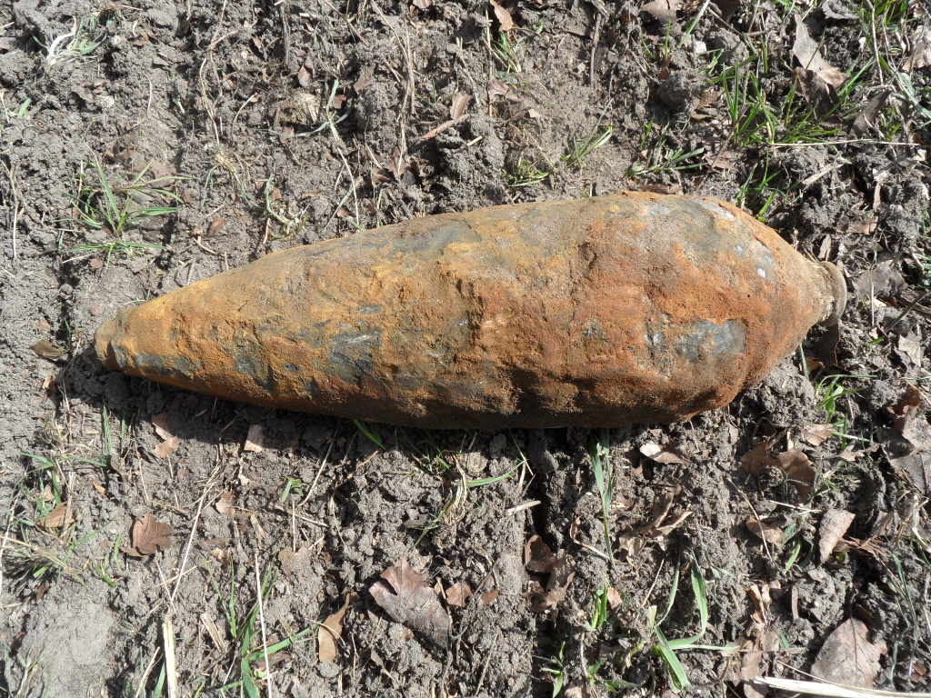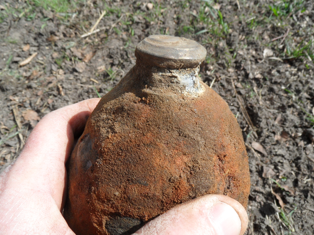 Als je deze granaat zo hebt gevonden in een veld: niet aankomen en de hulpdiensten verwittigen. Bodemvondst projectielen zijn niets om lichtzinnig mee om te gaan.