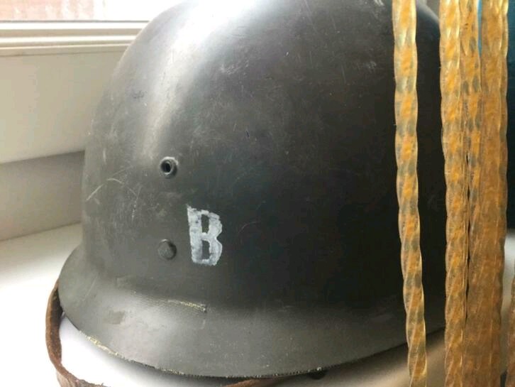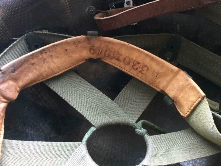 De witte letter B op de voorzijde van de helm betekent dat hij bestemd is geweest voor burgerpersoneel. Op de zweetband staat een legernummer vermeld.