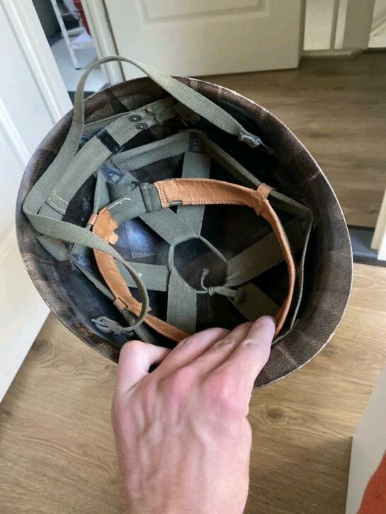 Het ziet er inderdaad wel uit als een Nederlandse M53 binnenhelm. Als ik het goed zie dan staat er een stempeltje in de bol van de helm. Misschien staat er ook nog wel een merkje naast. Kun je hiervan een foto plaatsen?