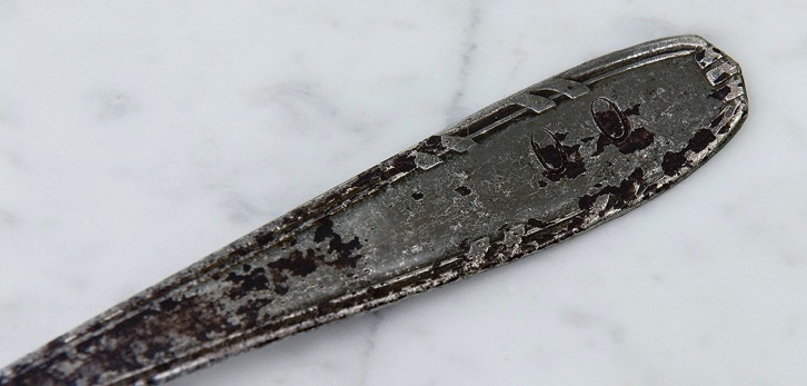 Een verzamelaar van bestek heeft mij eens verteld dat mijn onbekende lepel vermoedelijk uit de twintiger jaren van de vorige eeuw stamt. Hij kon dit blijkbaar zien aan de manier waarop de steel aan de lepel (schepgedeelte) bevestigd is. Je zou kunnen zeggen, hij wist of hoe de spreekwoordelijke vork in de steel zat.