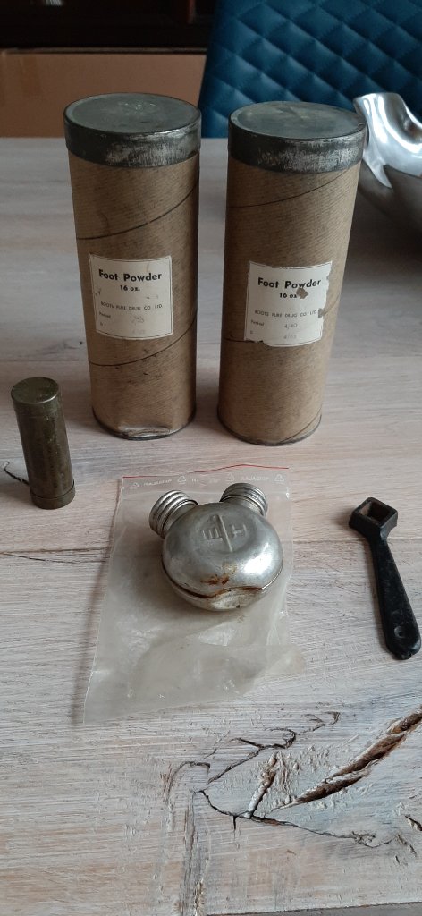 Weer eens een dagje rond gesnuffeld en toch nog wel wat leuke dingetjes gevonden! 2 WO2 Britse Foot Powder bussen. Een Amerikaanse gezichts verf stick uit de Tweede Wereldoorlog. (Met replica gebruiksaanwijzing) Een naoorlogs Soviet olie busje, kleine miskoop dacht eerste instantie dat het uit de Tweede Wereldoorlog was. Maar was niet de enige die aan het zoeken was, vandaar de haast