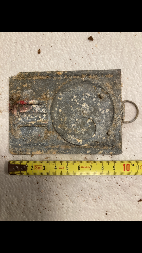 Ook uit het Duitse putje: een plaatje met een draaibare schijf en schuif. Met hangertje zonder merk / logo.