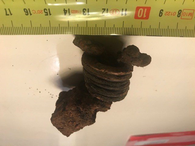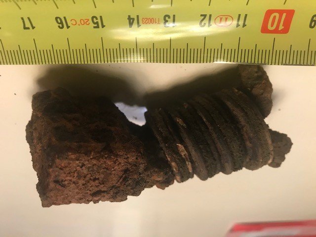 Wat ik op het eerste zicht dacht van het stuk ijzer met ringen was prikkeldraad bevestiging, maar na het stuk grondig schoon te maken leken het wel tentzeilringen (het is precies zacht materiaal tussen 2 metalenschijfjes) maar dat leek me dan weer onlogisch (4 ringen op mekaar op zo'n kort stuk metaal).
