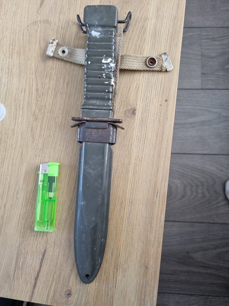Ik heb dit mes met schede gekregen. Nou is de schede duidelijk amerikaans m8a1. Maar nou vraag ik me af welk land het mes vandaan komt. Ik vermoed na oorlogs maar zou er graag wat meer info over willen.
