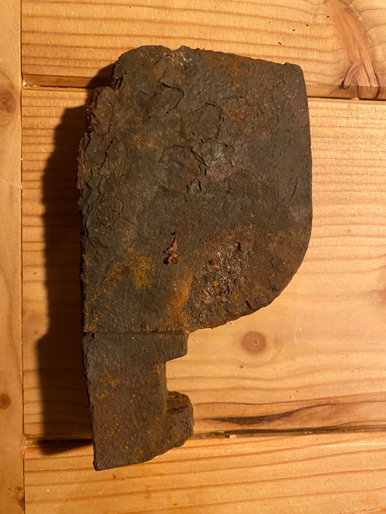 Het andere object is een stalen plaat met rondende afwerking en een soort sleuf. Vooral van dit object ben ik zeer benieuwd wat het kan zijn, en welke functie het had. Het is uiteraard afgebroken en er lagen meerdere soortgelijke stukken met diezelfde sleuf erin.