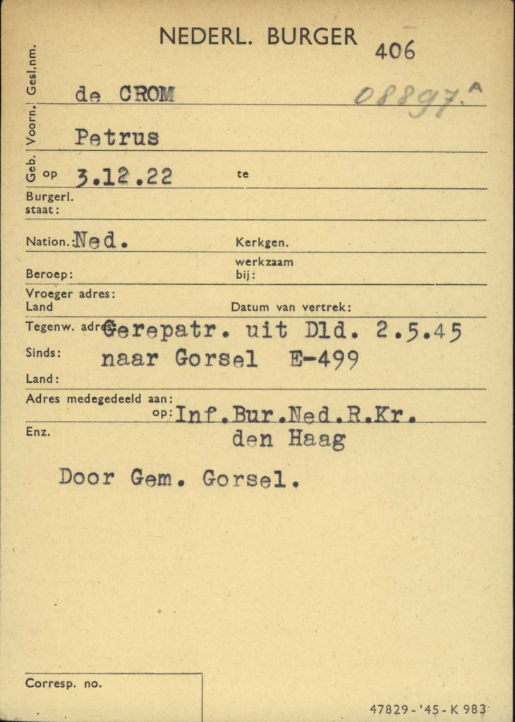 Op 2 mei 1945 is hij vanuit Duitsland gerepatrieerd naar Gorsel E-499.