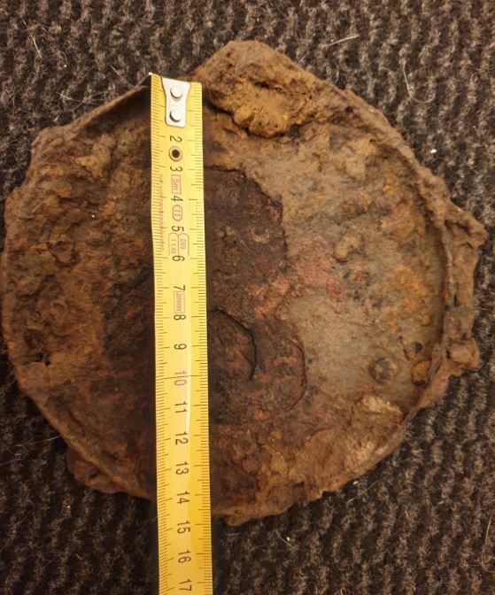 Er zit een duidelijke opstaande rand aan "de binnenkant" van het object. Van buitenkant rand tot buitenkant rand is het ongeveer 16,5 cm/17 cm. Van opstaand randje tot opstaand randje is ongeveer 14,5 cm. Het object is relatief rond en best zwaar. Ik denk zelf dat het een afsluiting van iets geweest is, maar van wat?.