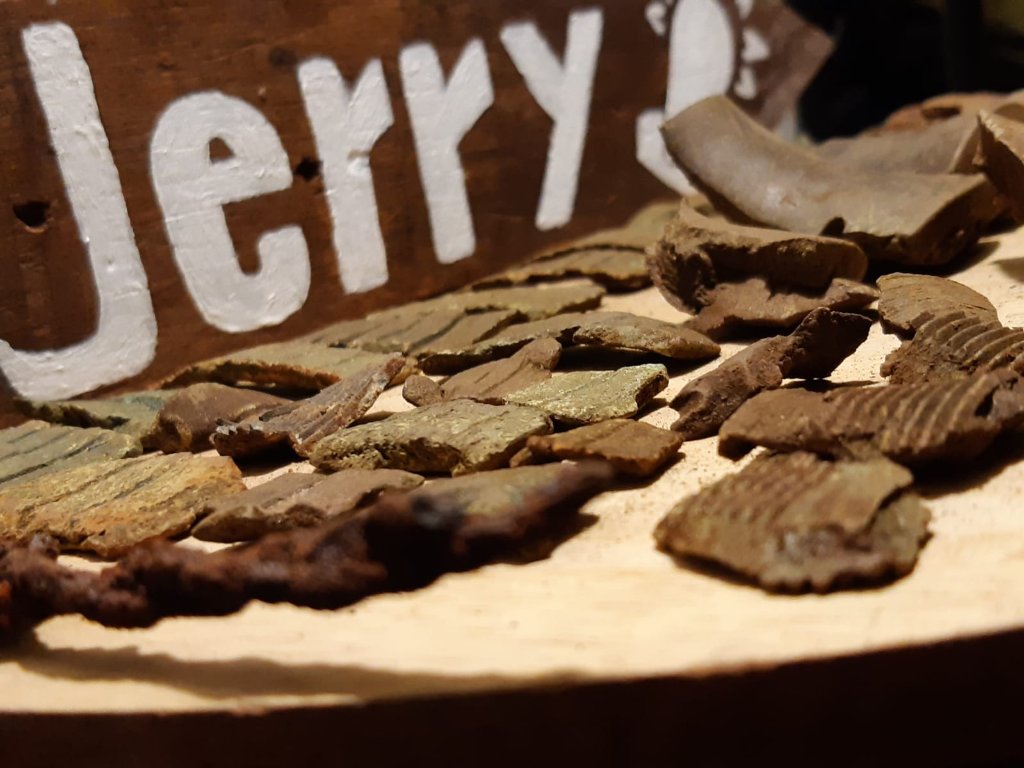 Ik snap dat de streepjes aanwezig zijn bij een verschoten projectiel. Echter is de band niet centimeters breed, zoals dat op bovenstaande foto's en in mijn gevonden stukken/stukjes te zien is. Mijn vraag is daarom, hoe ver loopt die band eigenlijk door in huls, en waarom liggen die stukjes "geleideband" midden in een weiland?