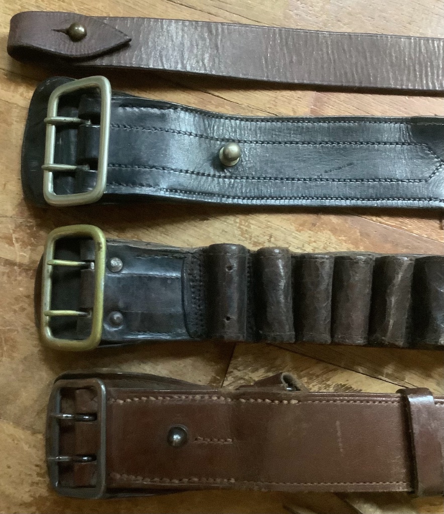 Mogelijk : een Sam Brown/ Bokkentuig (135 cm), een 14 stuks patronenriem (100cm) en een zwarte riem van de politie (130 cm)