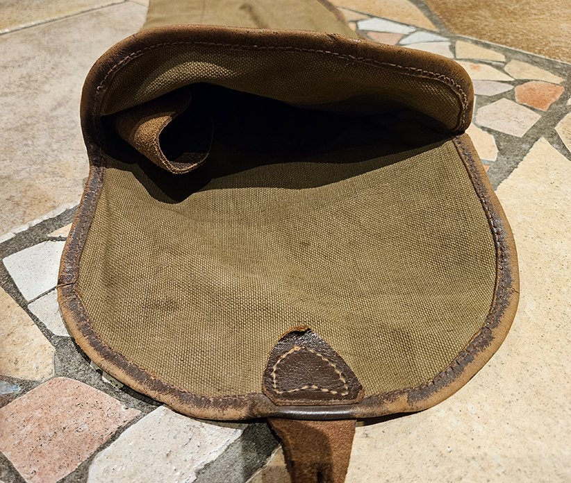 Het eerste object, een wapen foudraal. Qua afmetingen en vorm doet hij mij denken aan een foudraal voor een M1 karabijn. Mogelijk een naoorlogse variant? De foudraal heeft geen zichtbare stempels. De lederen flap aan de binnenzijde (4e foto) is voorzien van een mogelijk handgeschreven naam maar deze is onleesbaar.