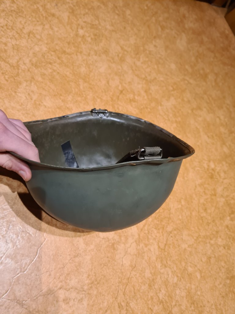 Ja en ja. De flits kan het natuurlijk wat verkleuren, maar de verf aan de binnenkant lijkt mij origineel en van de iets bruinere variant groen die gebruikt werd voor de wat vroegere helmen. Als het goed is is hij gedateerd aan de binnenkant van de rand, aan de voorkant.
