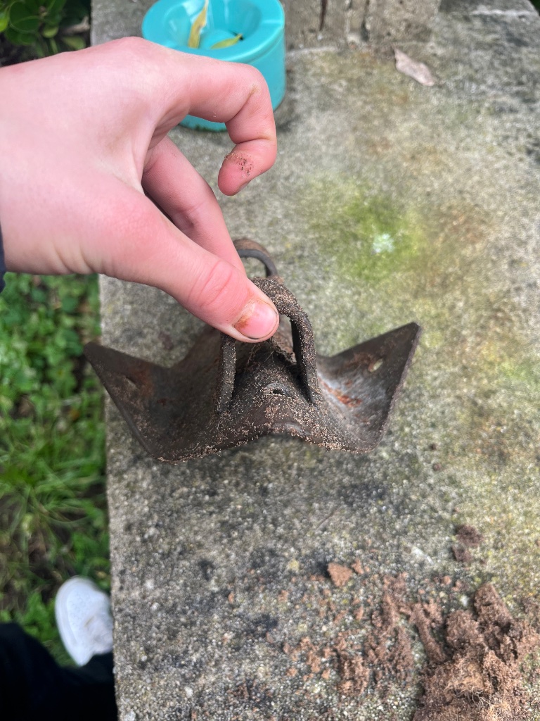 hoi, doet mij heel erg denken aan hang en sluitwerk. wel verbogen, maar het deel waar een grendel in heeft gezeten. om een schuurdeur mee af te sluiten.