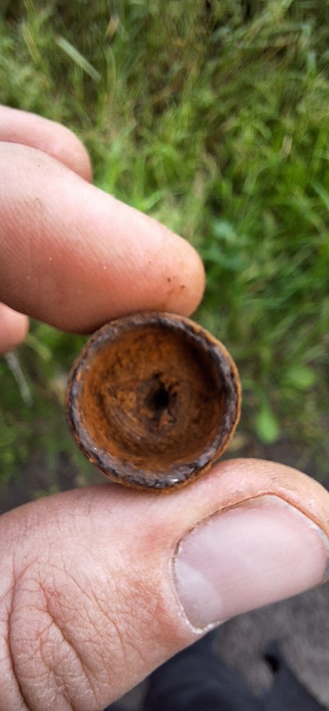 Zo op het oog de hulsvoet van een caliber 12 of 16 hagelpatroon. De rest van de huls was van karton.